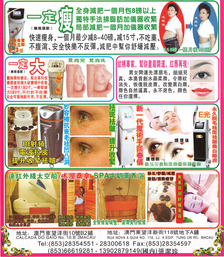 專業減肥豐胸配合高科技儀器, 獨家秘方針對頑固黑斑、面黃、嚴重暗瘡、黑頭、粉刺、黑眼圈、眼袋、祛皺、平滑凹凸洞、收毛孔、 提升收緊,美白保濕、在短時間內有神奇之功效,使肌膚細嫩光滑,白里透紅、亮麗照人。